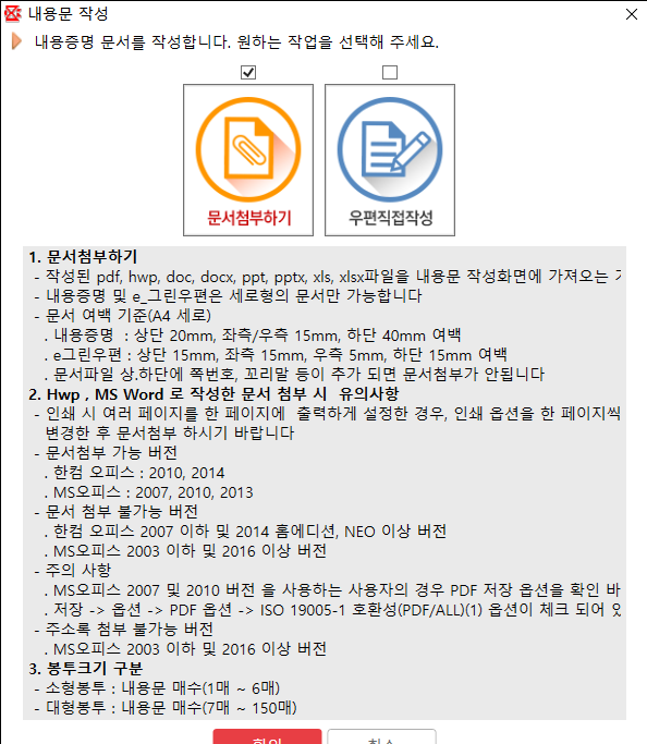 4. 2번 과정을 패스하신 분은 우편직접작성을 선택하고, 2번을 진행하신 분은 문서첨부하기 누른 후 첨부하세요.