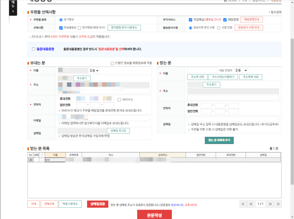 3. 받는 분 작성하여 넣고 부가서비스 및 선택사항 선택 후 본문 작성 누르면 문서 첨부와 우편 직접 작성이 나옵니다.