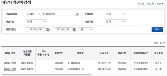 2021년 롯데칠성음료의 배당정보가 궁금하여 찾아보았습니다!