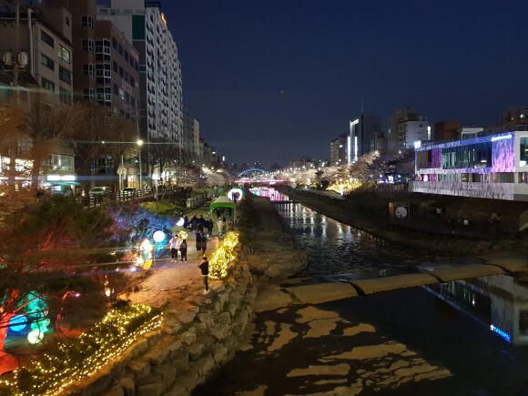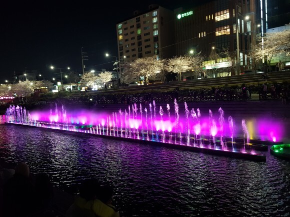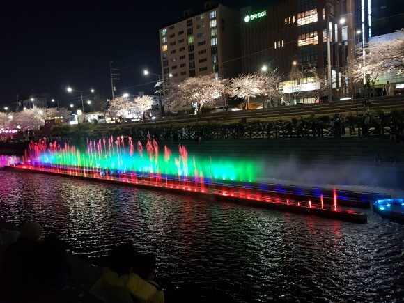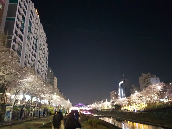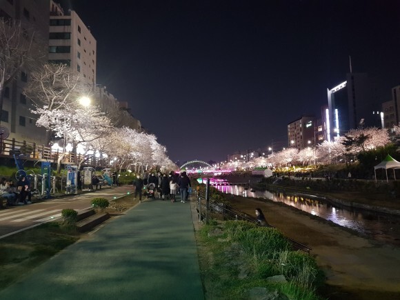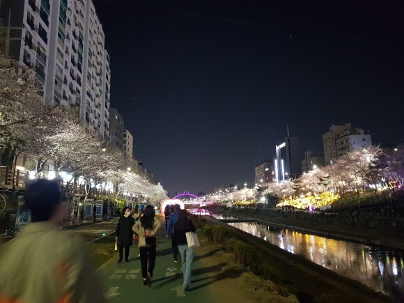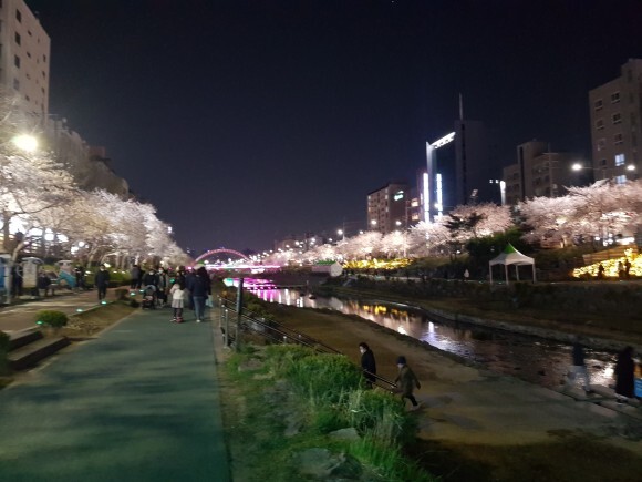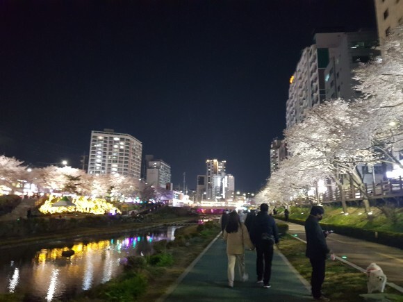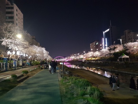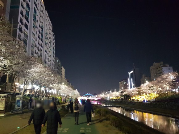 천에 비추는 벚꽃들과 벚나무들에 비치는 조명들이 너무 아름다웠어요.