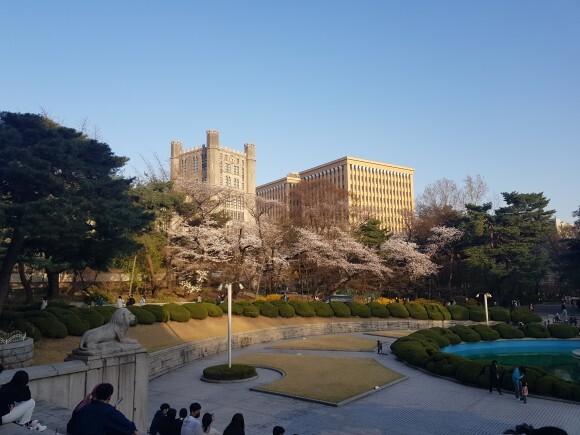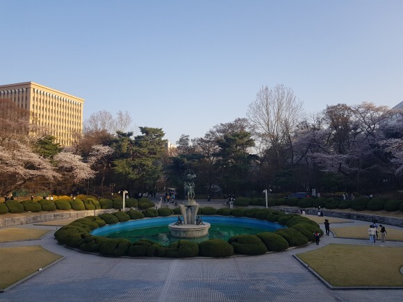 경희대 건물과 분수대와 어우러진 벚꽃들이 너무 아름다웠어요.
