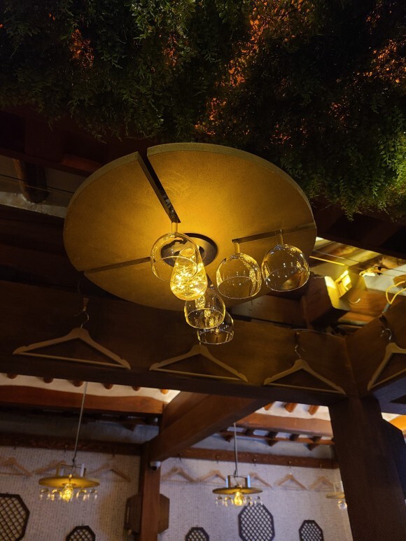 테이블 위에는 조명과 와인잔들이 셋팅되어 있어요. :)