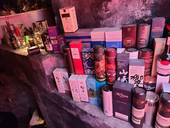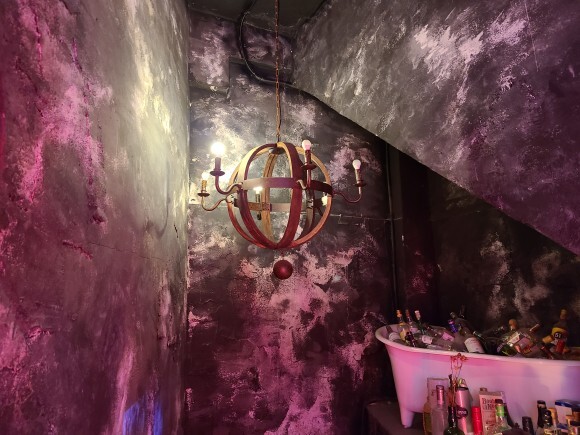 천장에 메달린 등과 옆에 놓여져 있는 술 박스들.