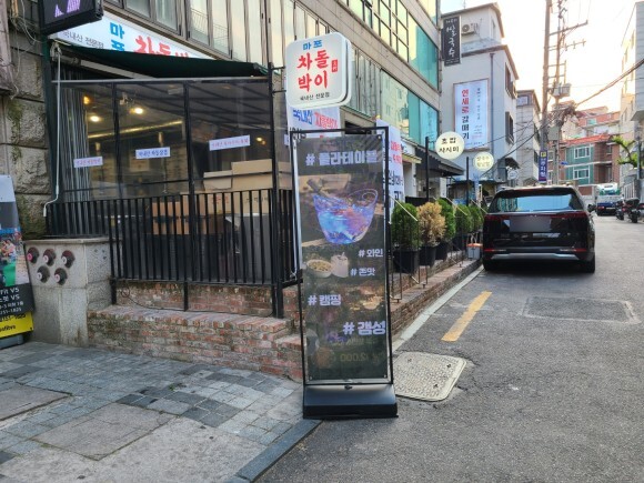 1번 출구에서 나와서 조금 걷자마자 바로 가게 입간판이 보여요. :)