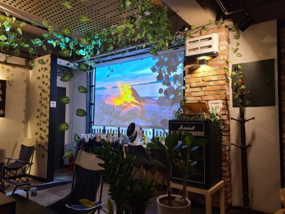우와 자리에 앉아 빔프로젝트에 나오는 영상도 찍어봤어요. 모닥불 소리가 타닥타닥 힐링 되는 느낌 :)