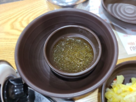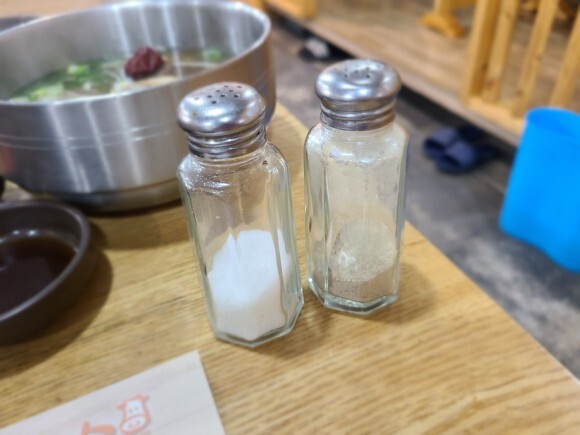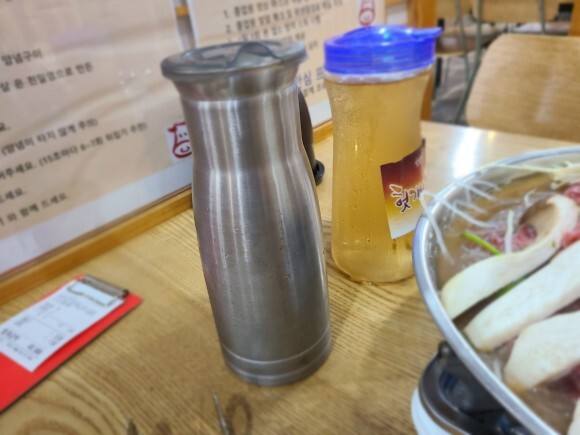 스텐레스 통에 담겨 있는 것이 육수, 플라스틱 동에 담겨 있는 것이 물이였습니다. :)