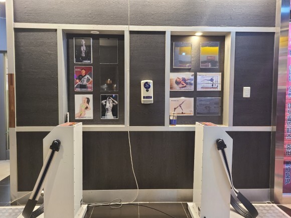 입구에 트레이너 샘들 사진과 회원님들의 바디프로필 등 볼 수 있었어요.