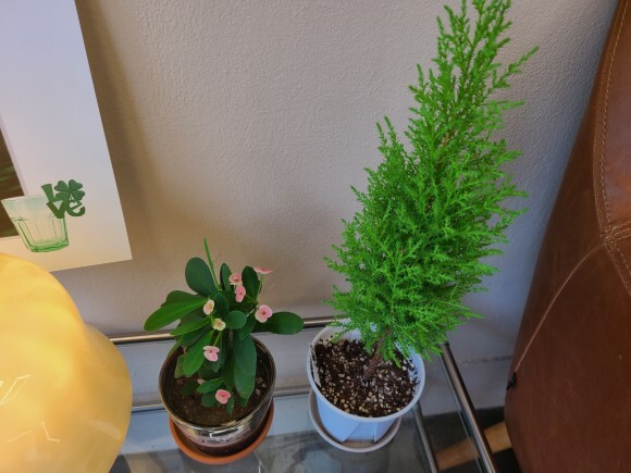 식물도 너무 귀여워요. 율마와.. 이름 까먹은 식물이 보이네요. 꽃기린이던가? 넘 귀여워서 찍어봤습니다. :)