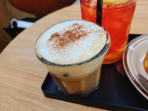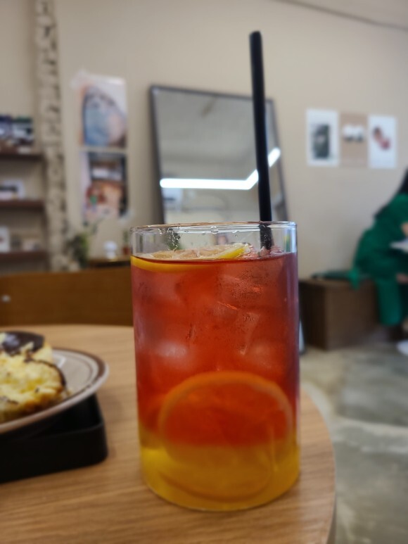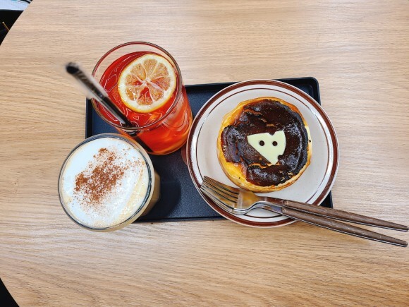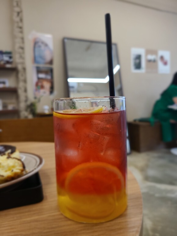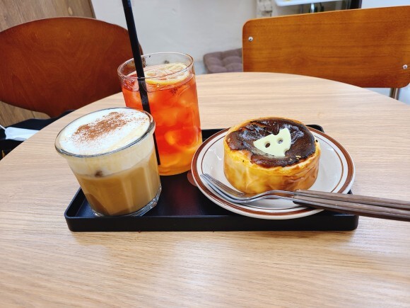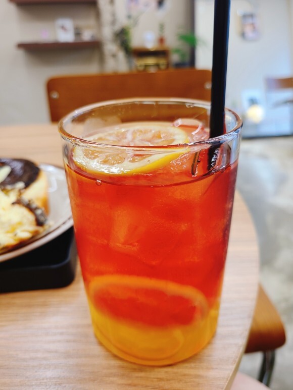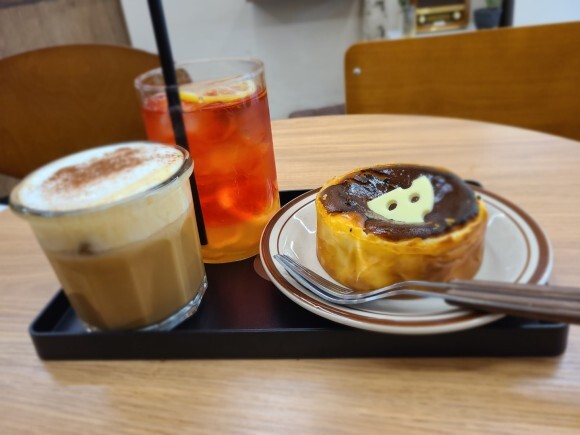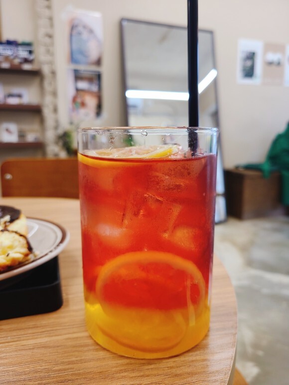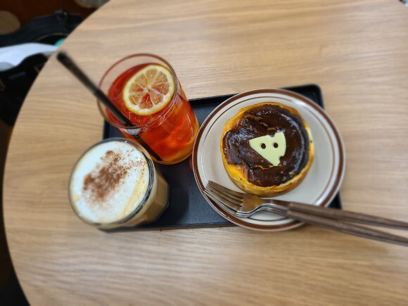 저희가 주문한 마우시 라떼, 썸머 레드 레몬티, 번트 치즈 케익이 나왔습니다. :)