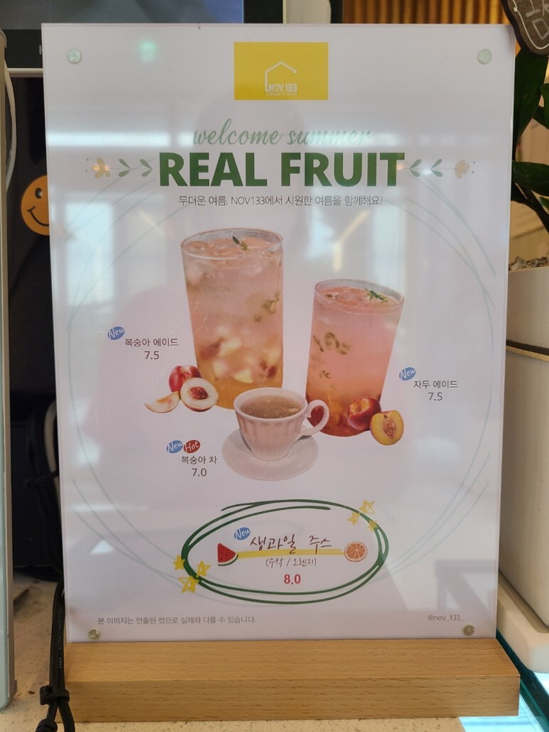 생과일 쥬스 메뉴도 있네요. 복숭아 에이드(7.5) 자두 에이드(7.5) 복숭아 차(7.0)