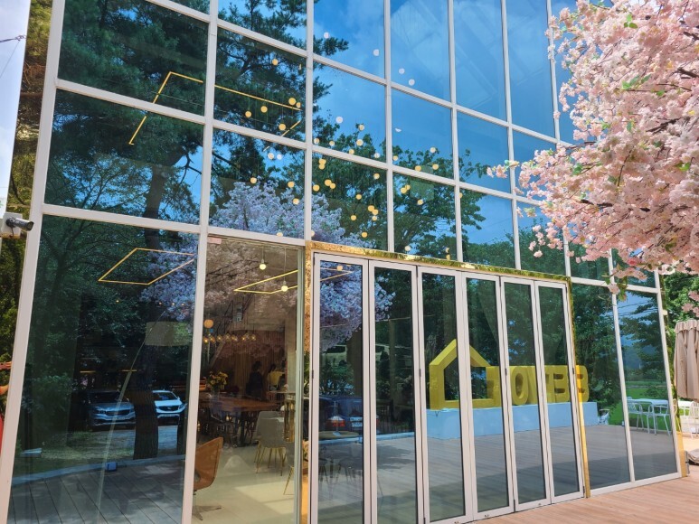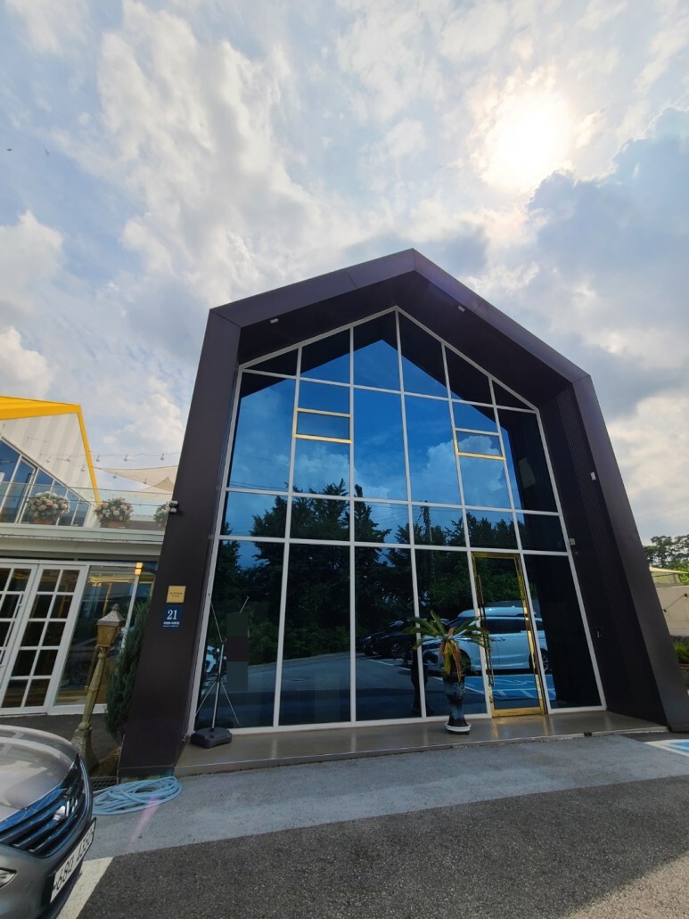또한 전면 외벽 거울 유리로 인하여 카페에 비추는 날씨와 카페 안 조명 등이 조화를 이루며 너무 이쁜 거 있죠?