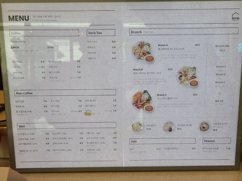브런치 셋트의 음료는 6천원 기준이라 라떼의 5백원 추가! :)