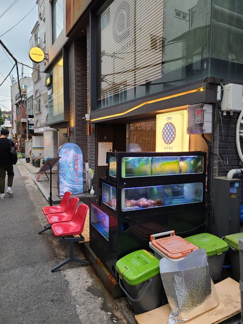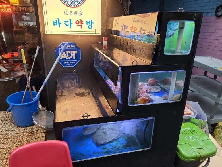 가게 앞 수족관에 해산물이 많네요 :)