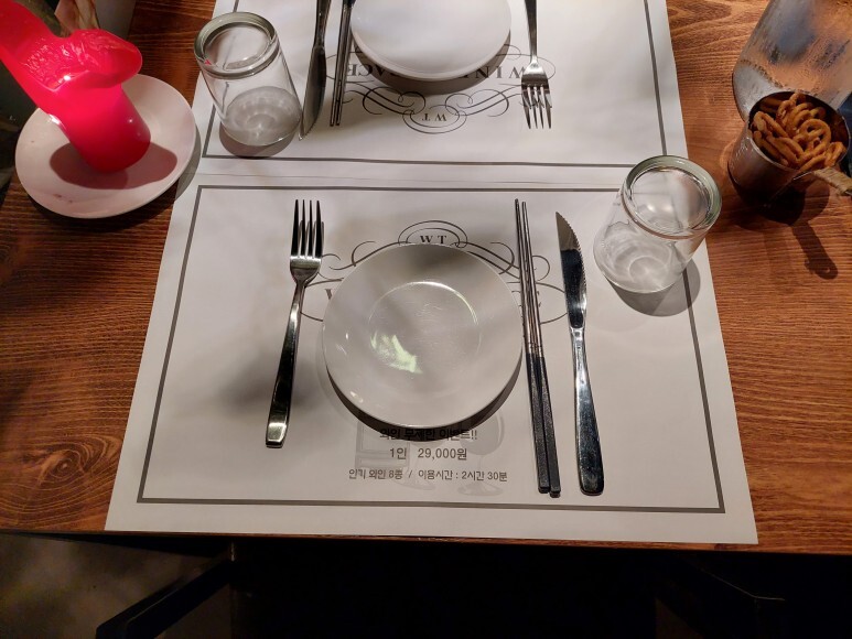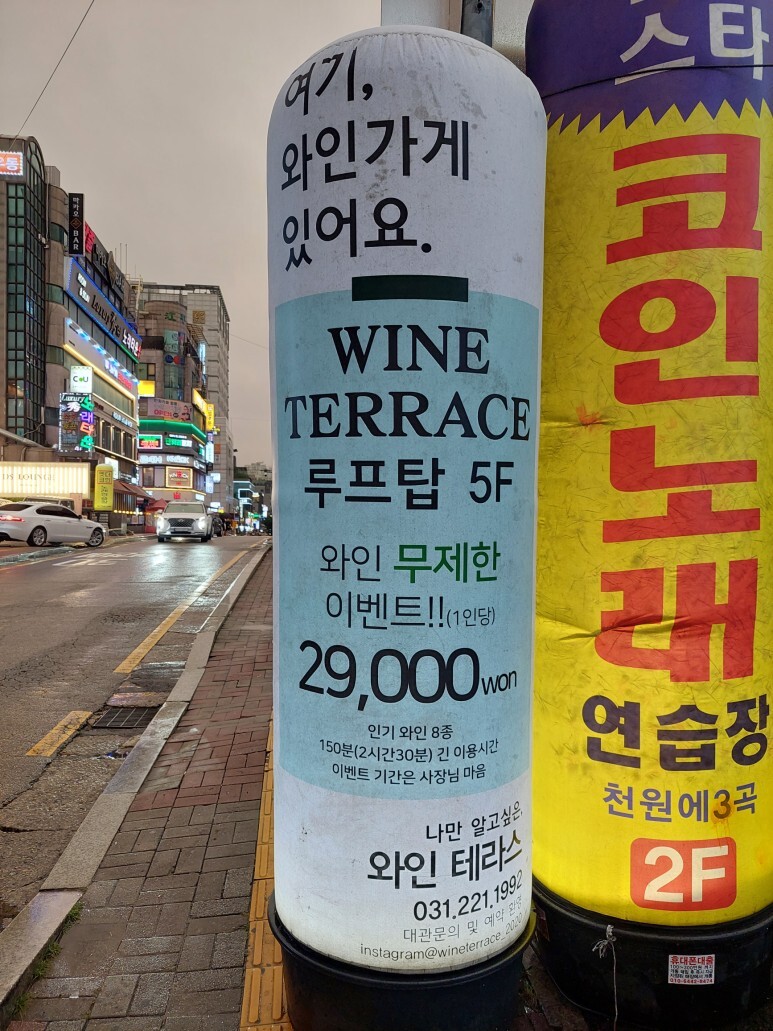 5층 루프탑에 위치해 있고 와인 무제한 이벤트가 진행 중이라고 해요. 인당 29,000원만 내면 와인을 무제한으로 이용할 수 있다고..
