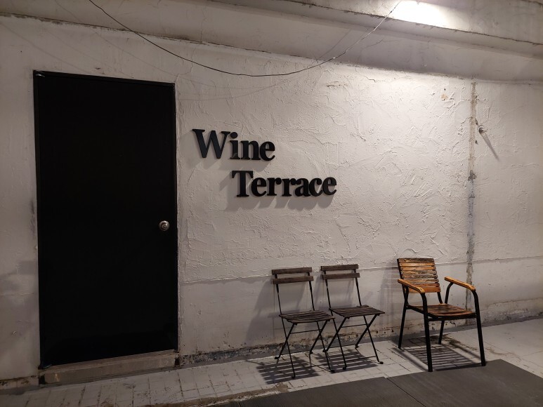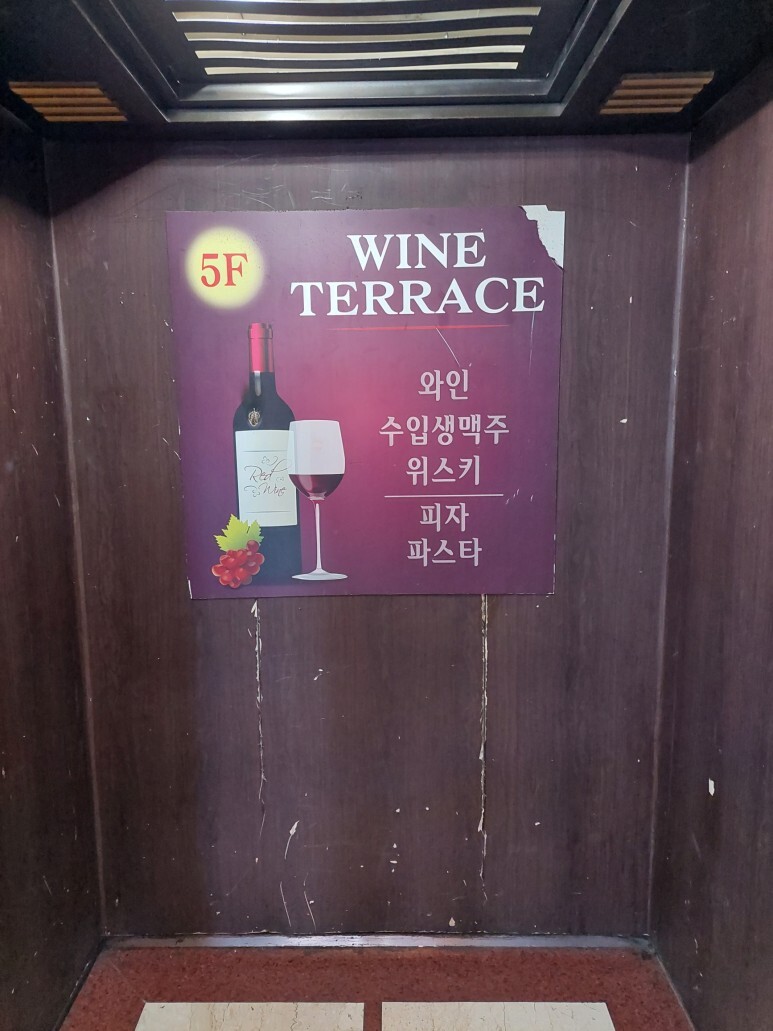 건물 들어가자마자 엘리베이터 앞에 적혀 있었고요. 와인테라스 5층! 따악!