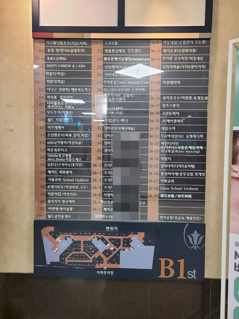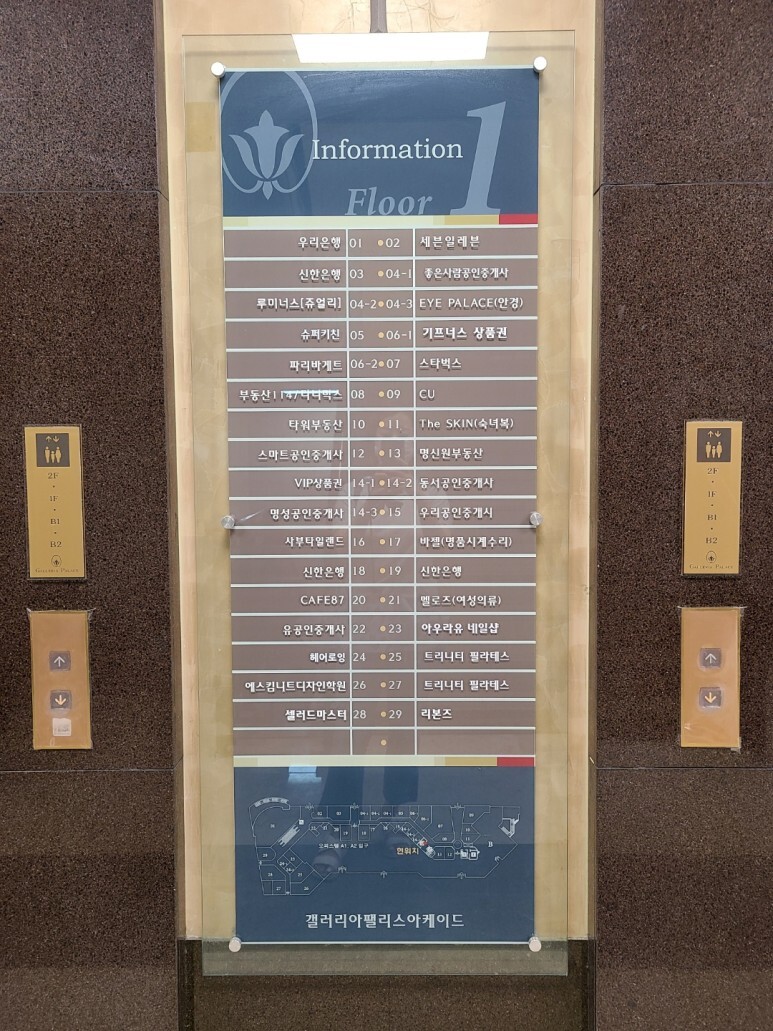 오..?? 들어가자마자 찍은 갤러리아팰리스아케이드.. 이곳은 지상 1층에 대한 안내라서 비앤채가 보이지 않는 군요.