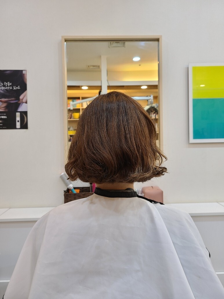 펌이 끝났습니당.. 머리 끝 부분 살짝 말려들어간 거 보이시죠? :)