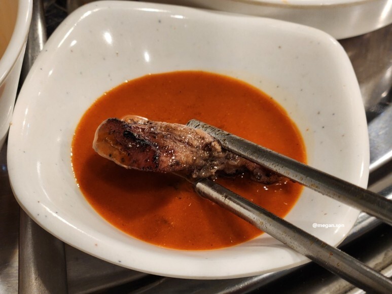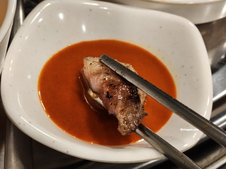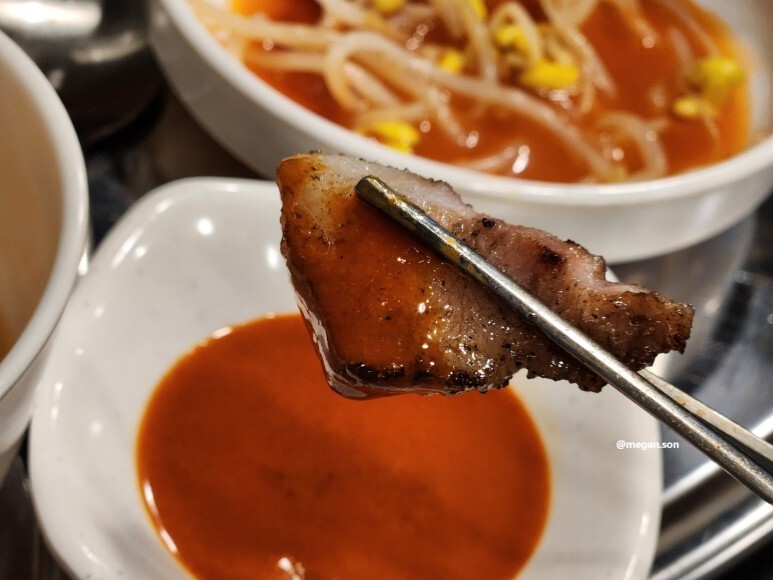 신촌 고기집의 특제 소스에 제가 찍어 먹어 보겠습니다.