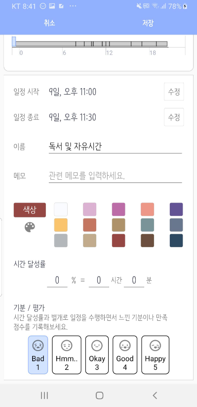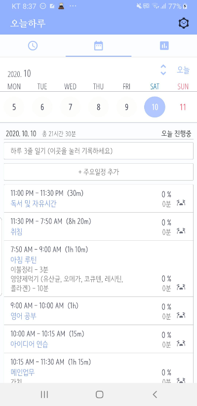 또한 아래와 같이 시간 달성률도 기록할 수 있을 뿐만 아니라 그 날의 성과에 대한 점수도 매길 수 있다.