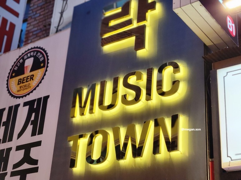 아래는 건대입구역 술집 락 MUSIC TOWN 의 간판이고요.