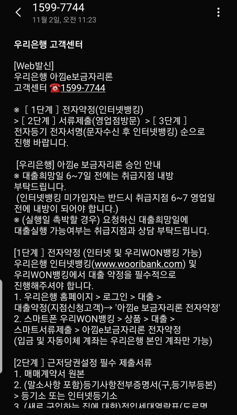 받자마자 대출 서류 관련 안내 사항이 있으니 이름과 생년월일을 알려달라길래 수상하여, 방금 전에 우리은행 지점으로 부터 서류에 관련한 안내사항을 받았는데 이건 또 무슨 전화냐? 라고 물어보니, 이런 저런 이야기를 하며 대출 서류 뿐만 아니라 전자약정 안내를 받으셨냐며 전자약정 신청을 먼저 받아야 한다라고 하며 안내를 해주더라고요.